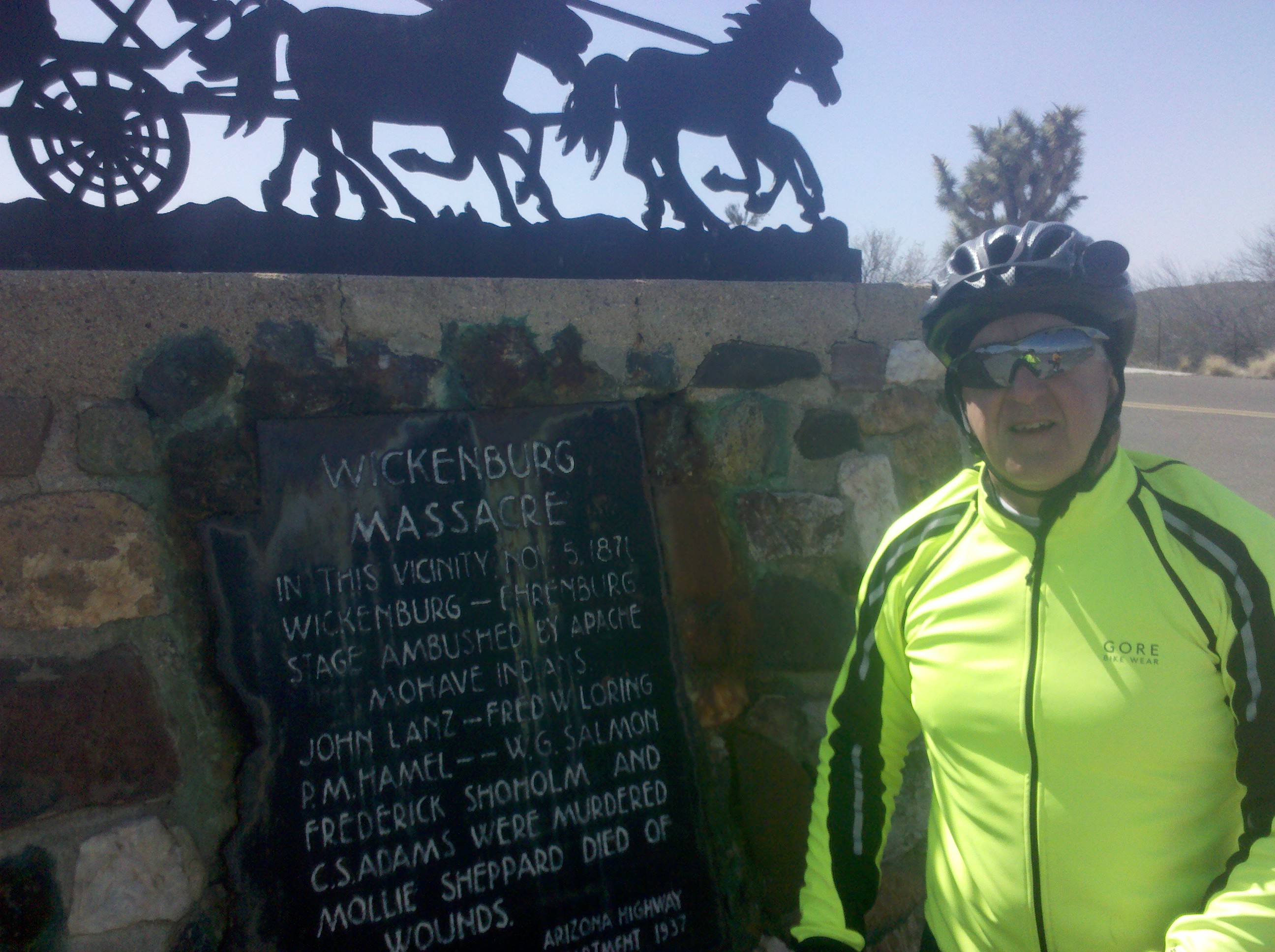 The day started with a breakfast of oatmeal, toasted bagels, and coffee in the kitchen of the Westward Motel in Salome, AZ. Then we packed up our bags, but them in the “great white,” our nickname for the Dodge minivan, applied sunscreen, took some Advil, and started off, finally getting on the road at about 9:00 am. Today’s ride was one of our quickest, aided by a strong mostly westerly wind that helped us complete the 55 mile ride in about 3.5 hours, even with 4 short breaks along the way. Our breaks were all pretty short, because once off the bike and not pedaling, it got cold in a hurry! We stayed on U.S. 60 the entire ride and, probably for the first time in the trip, the scenery was somewhat monotonous and not overly pretty. Nevertheless, we still took pictures and the ones I took during the ride are all below.